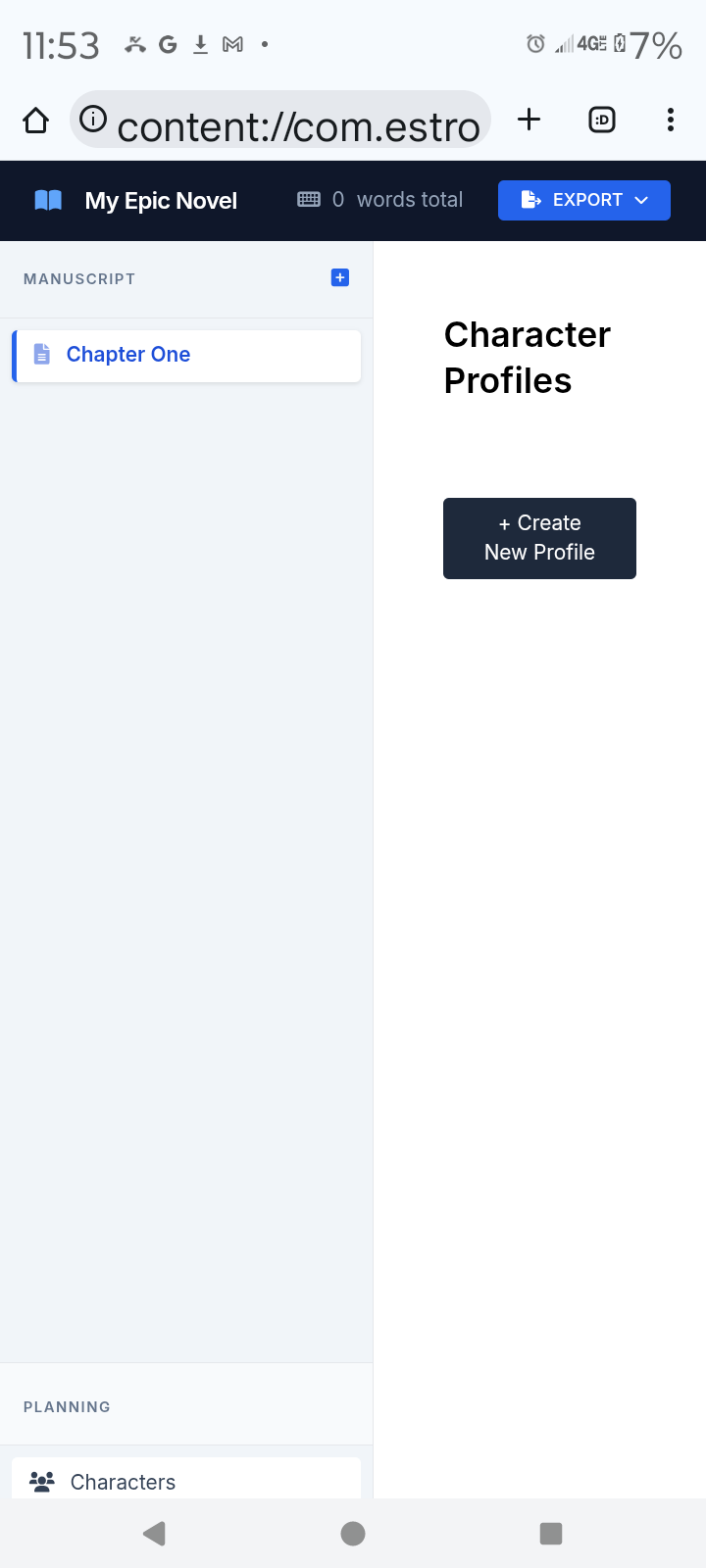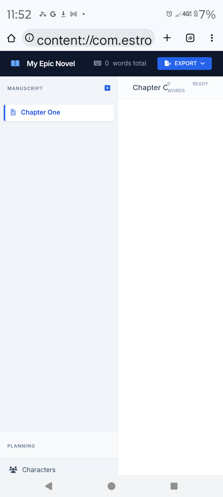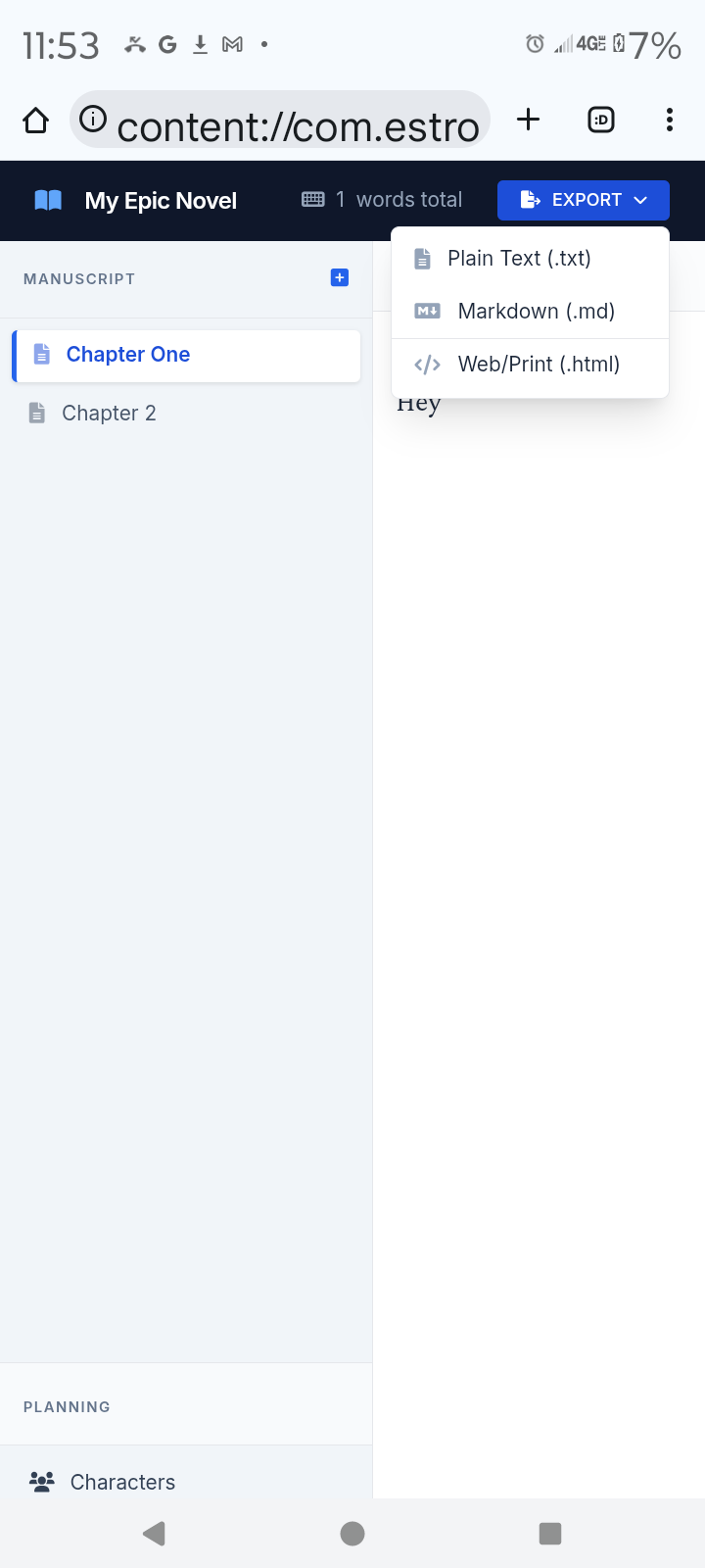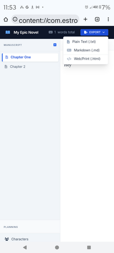 The app helps you make a novel with can be exported as text file or html.